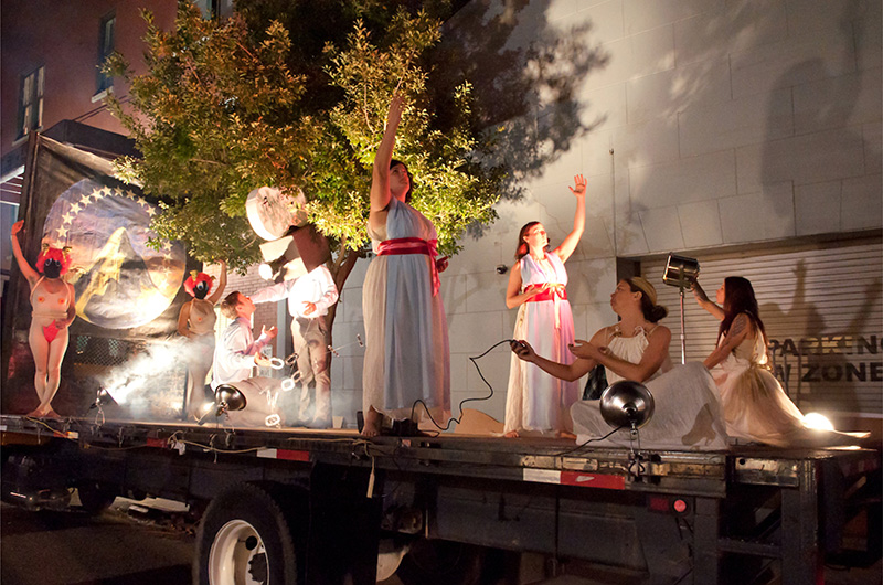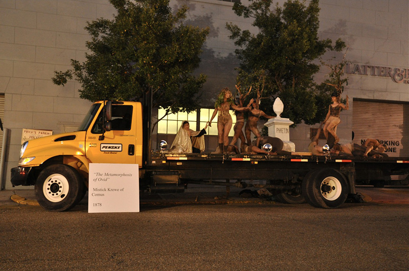 Cooper enacted a long distance exchange by delivering instructions from overseas artists for interpretation by the local Society members, who also created their own tableaux. Stage effects ranging from projection to fire accompanied the tableaux that were presented on a flat bed truck paraded slowly through various New Orleans neighborhoods.