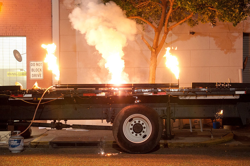Both Andrew and Klaas had worked with fans previously and Airlift decided it was a perfect match to bring their ideas together. They had never met, but it did not take long for us all to see that this was love! Their personalities, their ideas, and their talent created this fantastical house that uses tubes attached to handmade fan blades to create a unique and deeply harmonic sound. Pulling on ropes allows the player to change the speed of the fans and their tones. Fan blades slicing through the exterior of the house give this instrument of musical architecture a visual thrill that matches its sonic wonder.