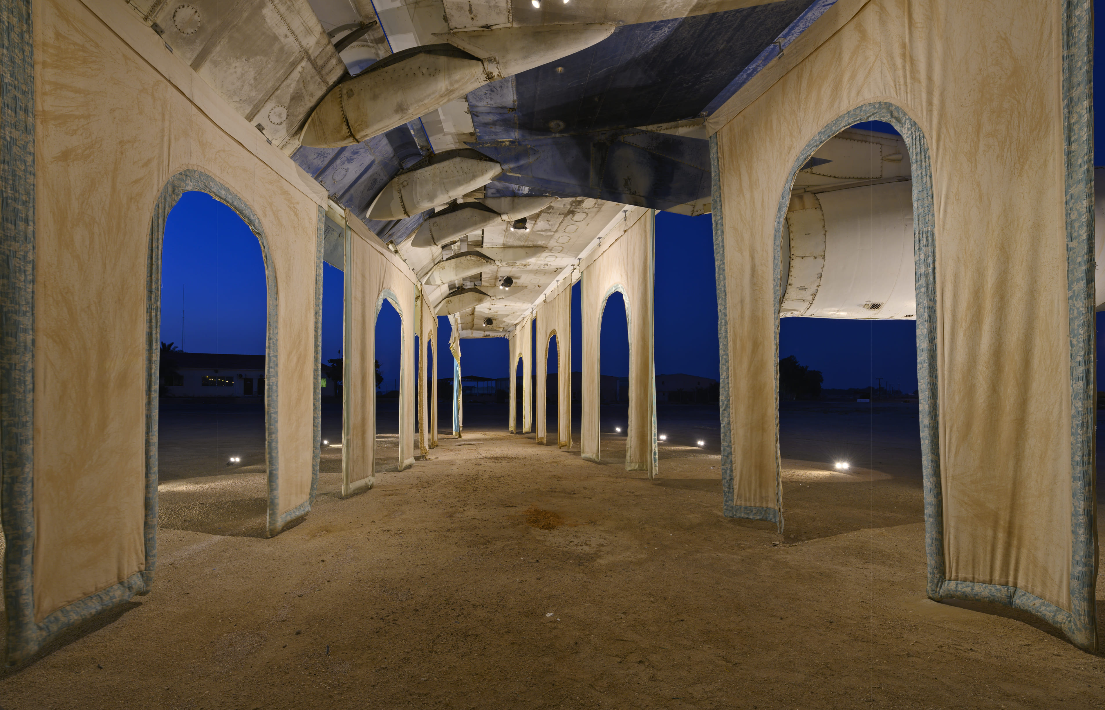 The artists have conceived of a project around an abandoned airplane in Umm Al Qawain, conjuring up thoughts of travel, immigration, destination, visitation, home, territory and borders. At the site of this derelict airplane, Airlift artists consider embodied states of coming, going and existing in between by posing questions about national and personal identity as well as the meaning of home. Informed by extensive interviews and community workshops with Emiratis and temporary residents living in the UAE, The Trans-National (2019) uses the abandoned airplane as an open and indeterminate space of self-projection, collective gathering and reflection. The installation presents UAE residents’ messages, lullabies and imaginings of home in traversable portals under the wings. In the plane’s cockpit are photos and videos contributed by members of the Emirati community. In some cases, these personal histories date from times before the country’s unification in 1971. An opening ceremony processional for the installation was conceived in collaboration with a number of UAE-based collaborators, including Freek, a UAE-born Somalian rapper; X, a UAE-born experimental singer and composer of Filipino descent; Monster Crew, a choreographer of South Asian descent; and dozens of other participants from South Asian communities. A programme of workshops, gatherings and talks continued on-site throughout the Biennial.