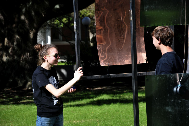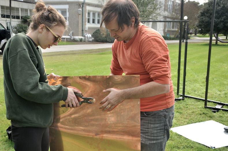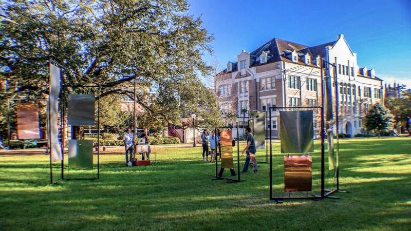 Architect Michael Glenboski and Tulane Professor of Music Technology Rick Snow led the project. Working with Airlift staff, Michael and Rick developed a flexible system of telescoping hinges to create modular enclosures and frames for hanging 12 metallic sheets of copper and steel. Rick worked with students to map over 720 resonant frequencies from these sheets and develop a custom synthesizer routing audio signals to the sheets. Transducers (essentially the magnetic portion of a speaker) placed on each sheet of metal resonated vocals, percussion and other sounds within the enclosures. The reverberation from sheet to sheet created a highly controlled and surprisingly dense area of sound. The Audience was able to manipulate the type, intensity, and locations of the sounds across the installation through hand tracking software. As luck would have it one of the architecture students, Haley Lindsley, is a classically trained Opera singer. She surprised us with an impromptu concert at the end of the weekend making the sheets of metal reverberate so strongly that it felt like you were in a concert hall when you closed your eyes.