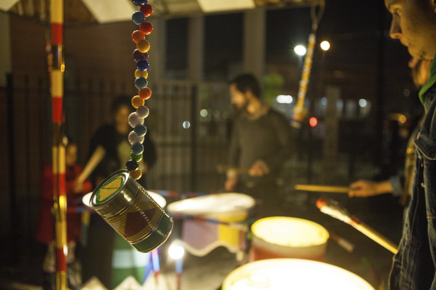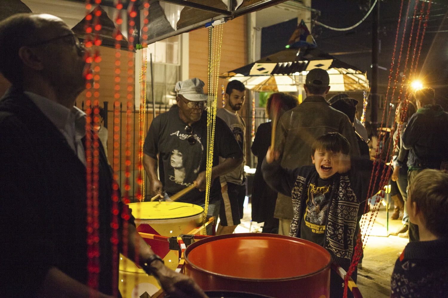 New Orleans Airlift partnered with Ashe Cultural Center to create a Music Box Outpost in Central City, New Orleans. Ashe's mission to celebrate African diaspora art and culture, along with a belief in community and commerce, informed a designe with influences from Africa, the carribean, and New Orleans in the form of a musical market place. New Orleans visual artist Carl Joe Williams led the design of the project while prominent Congo Square drummer, Luther Gray, provided musical direction for the piece as well as leading many nights of music with the public. Drawing on the idea of umbrella style market places, the artists created a trio of vibrant, tin, umbrella shapes and used 55 gallon metal and plastic drums, water bottles, tin cans, and oyster shells to create a sonic experience that erupted into amazing drum circles once the public got their hands on the piece.