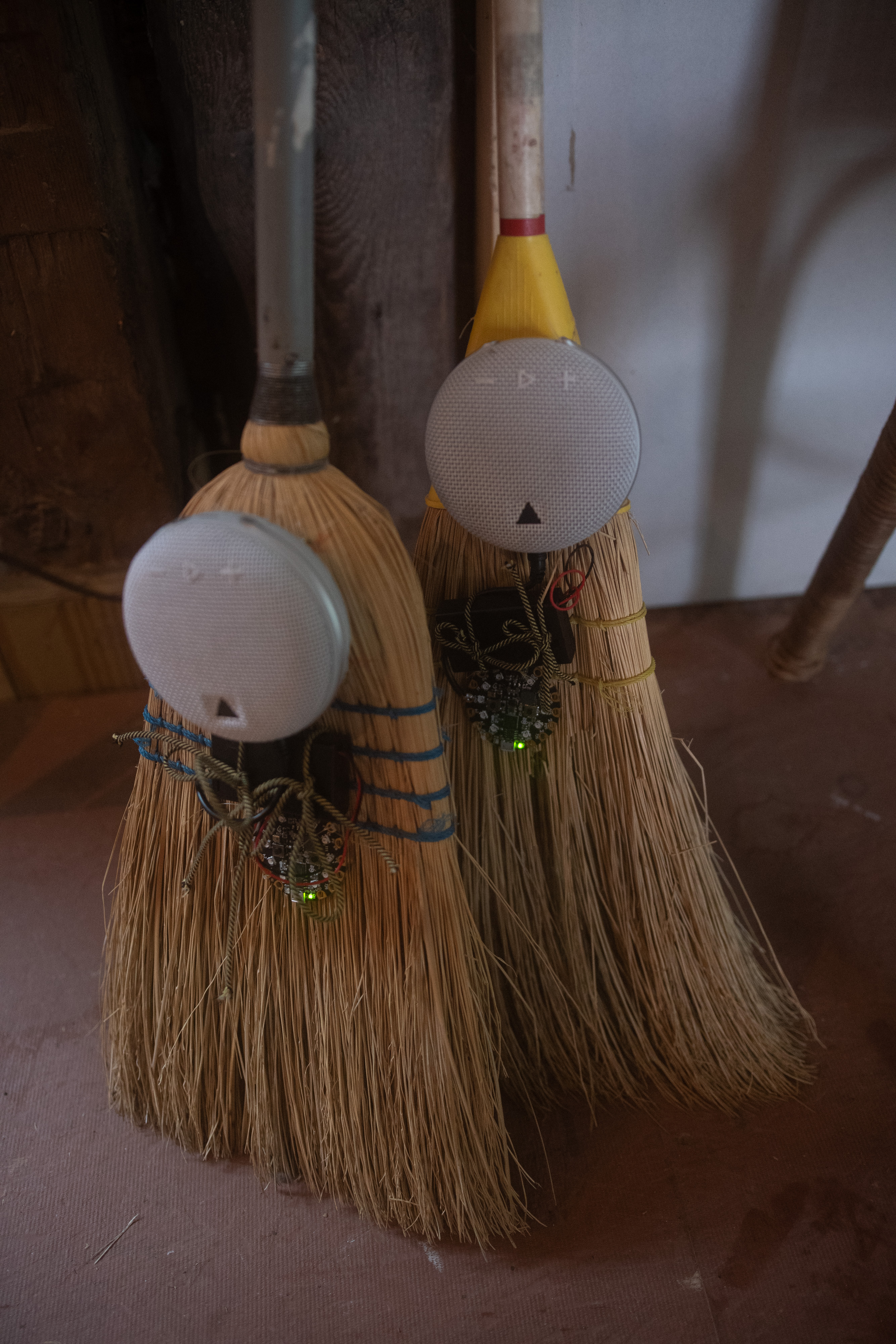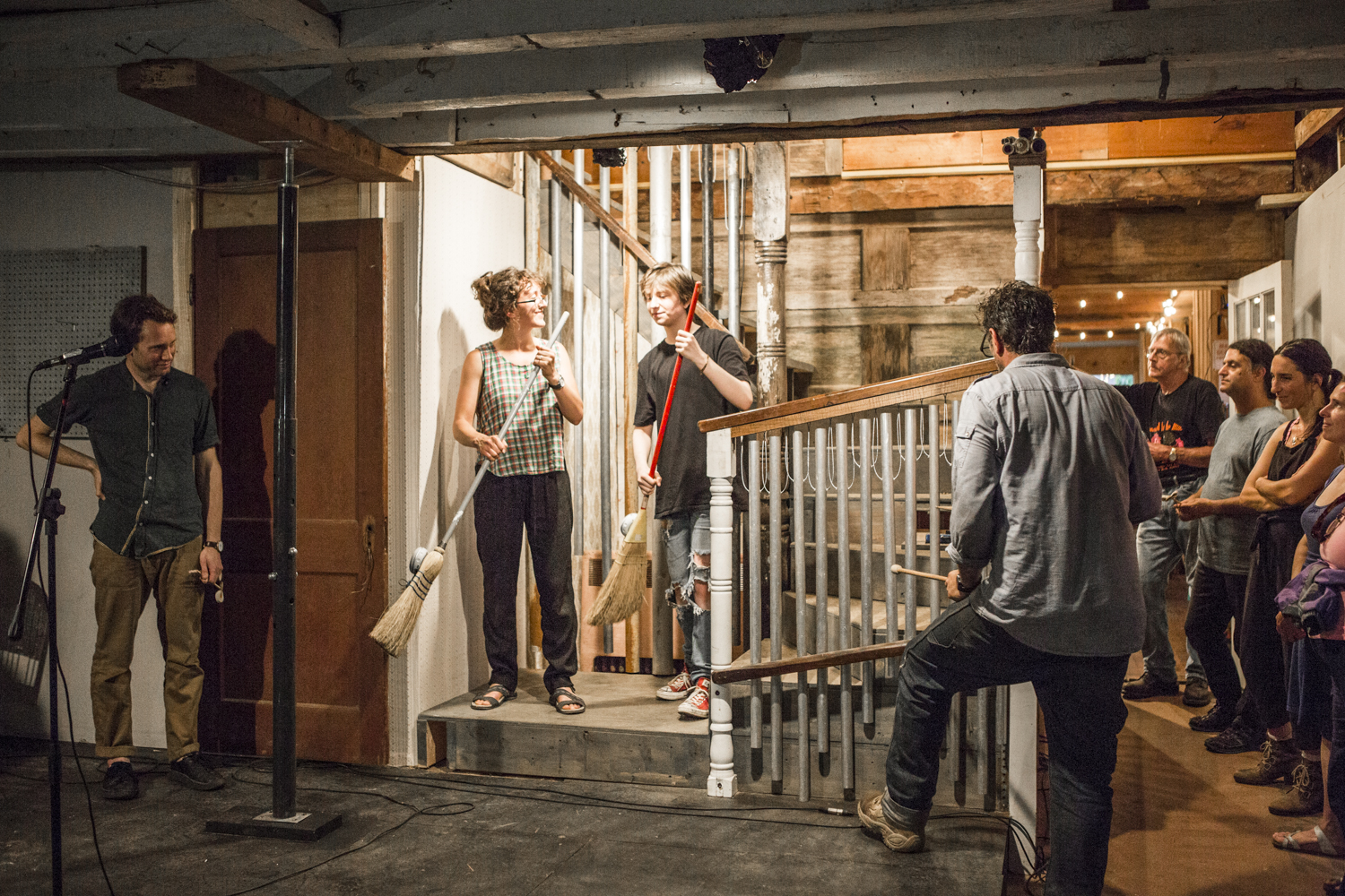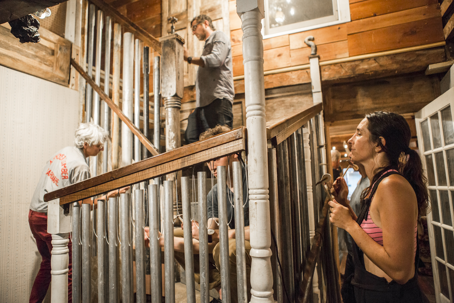 Taylor Shepherd and Delaney Martin led their first Music Box Outpost that saw musical architecture built into a real house. The Prattsville Art Center and Residency is a vital hub in a small Catskills, NY working class village. With regular art shows, visiting musicians, a coffee shop and a community library the center is a creative outlet for locals and visitors of all ages. Musical architecture is now dispersed throughout this well used and funky former hardware shop dating from the 1800’s. A door bell by Martin and Shepherd functions as a call and response to the local fire departments sirens that run tests at noon daily. Open the door to the sound of Terry Dame’s tinkling keys instrument triggered by the door. In the library Nic Yulman has installed a shelf of playable books. In the performance room Martin and Shepherd have customized a staircase to have a chime balustrade and steps that trigger beats. Dame and Yulman have instruments to be played on the walls and the ceiling while Ranjit Bhatnagar built an accordion into the wall. Bhatnagar also provided the center with his very popular musical brooms! The group of artists unveiled the permanent installation with a performance and it continues to be used by visiting musicians who incorporate elements of the work into their sets. Airlift has encouraged the center to commission more experiments to grow its musical architecture over time. As always it was a joy to be in community with the folks we met in Prattsville.