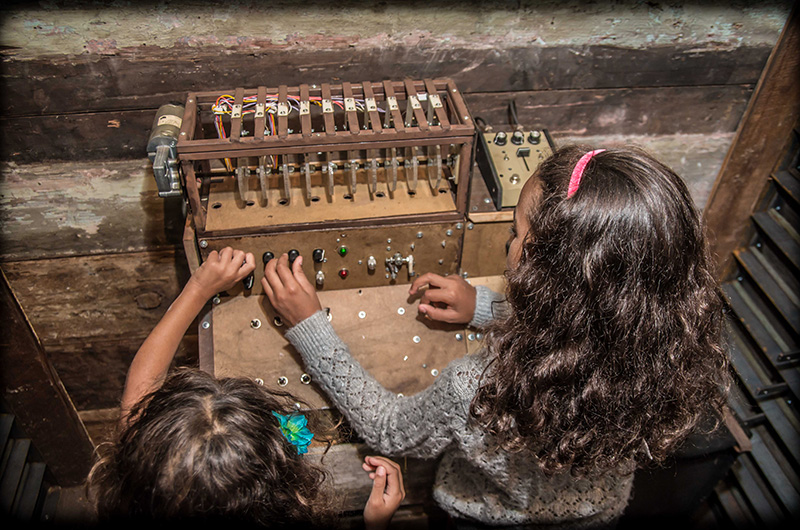 Our local team of artists were led by Peter Fetterman who galvanized the most awesome community of artists and musicians ahead of our arrival. Folks like Jon Mackey, whose musical greenhouse perched 20 ft. up on a catwalk built in just three weeks by Jimmy Cousins, along with a spiral staircase and a Thermin whose antenna was a geodesic dome. Josh October got an amazing sound out a barrel-based instrument he had been dreaming about making for years, while Brett Roberts‘ House of God harnessed the power of PVC pipes. Christian Maes made a bottle carillon that was so elegant and we even had a Windmill created by John Martin in collaboration with Laura Thompson.