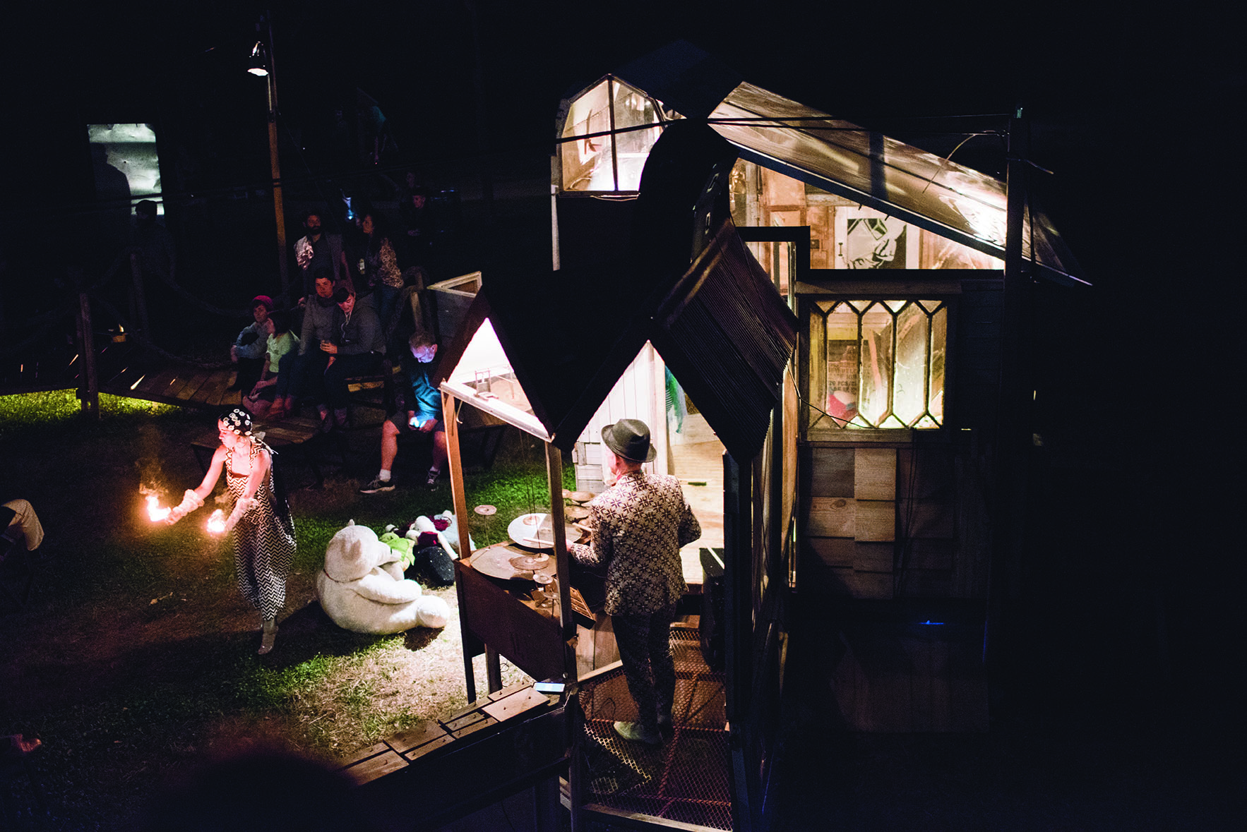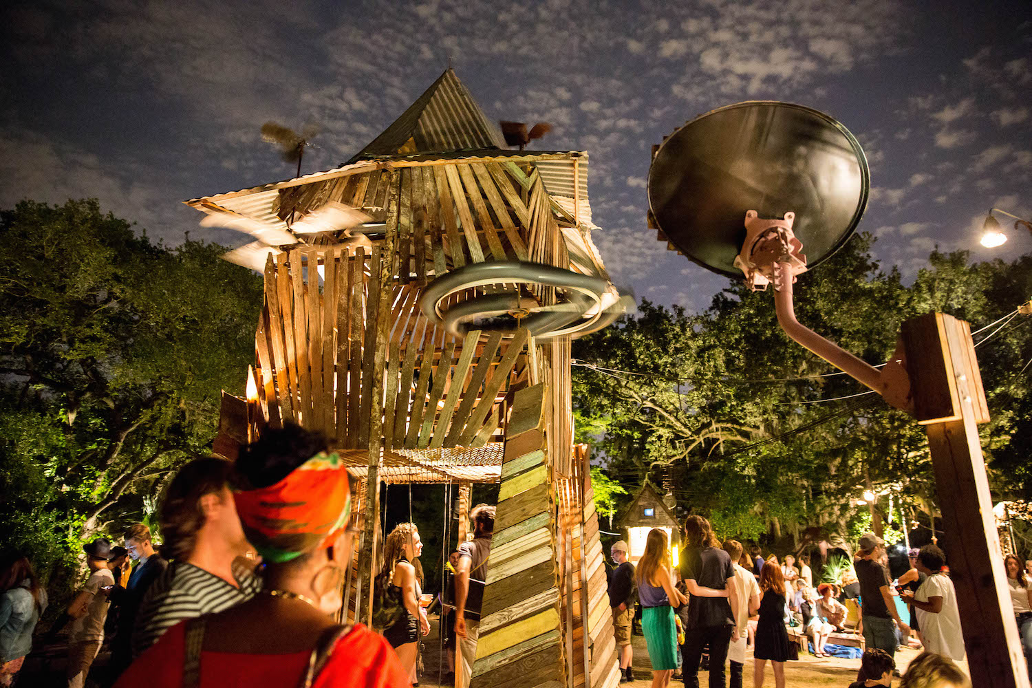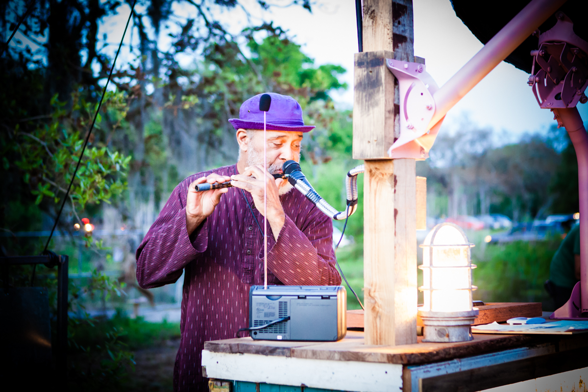 For this performance The Music Box Roving Village: City Park welcomed headlining Jazz Fest musicians Wilco, along with local musical stars, inventor/swamp pop legend Quintron, Dashing songwriter Luke Winslow-King, king of the avant-garde music scene Rob Cambre, freak-folk musician Dustan Louque and rock goddess Sean Yseult of White Zombie.